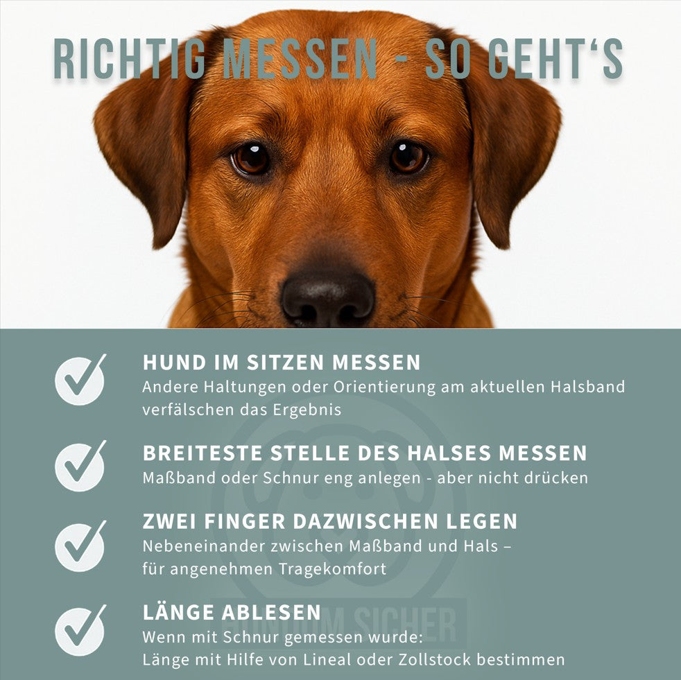 Bitte miss den Halsumfang deines Hundes sorgfältig nach unserer Anleitung – das Set sollte so eng sitzen, dass es nicht über den Kopf gestreift werden kann, und gleichzeitig so locker, dass es angenehm zu tragen bleibt.